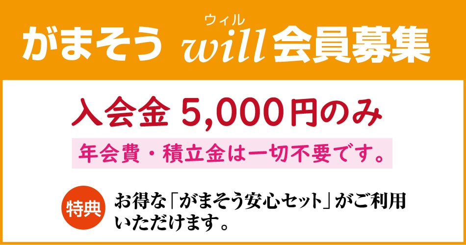 がまそうの葬儀プランには、葬儀に必要な項目がすべて含まれており、心のこもった充分なご葬儀を開くことができますので、ご安心ください。